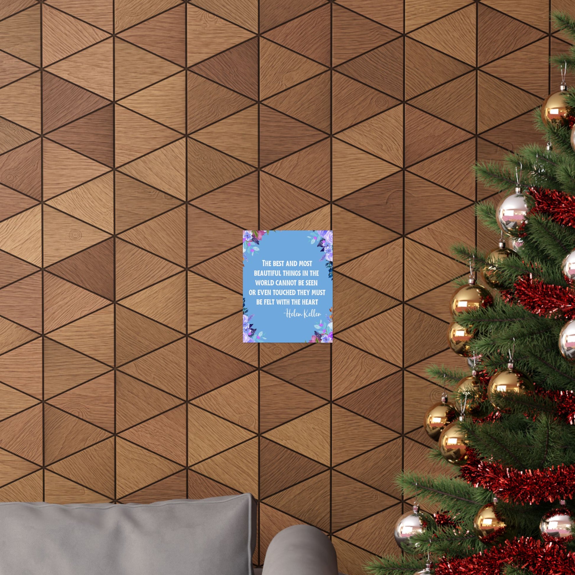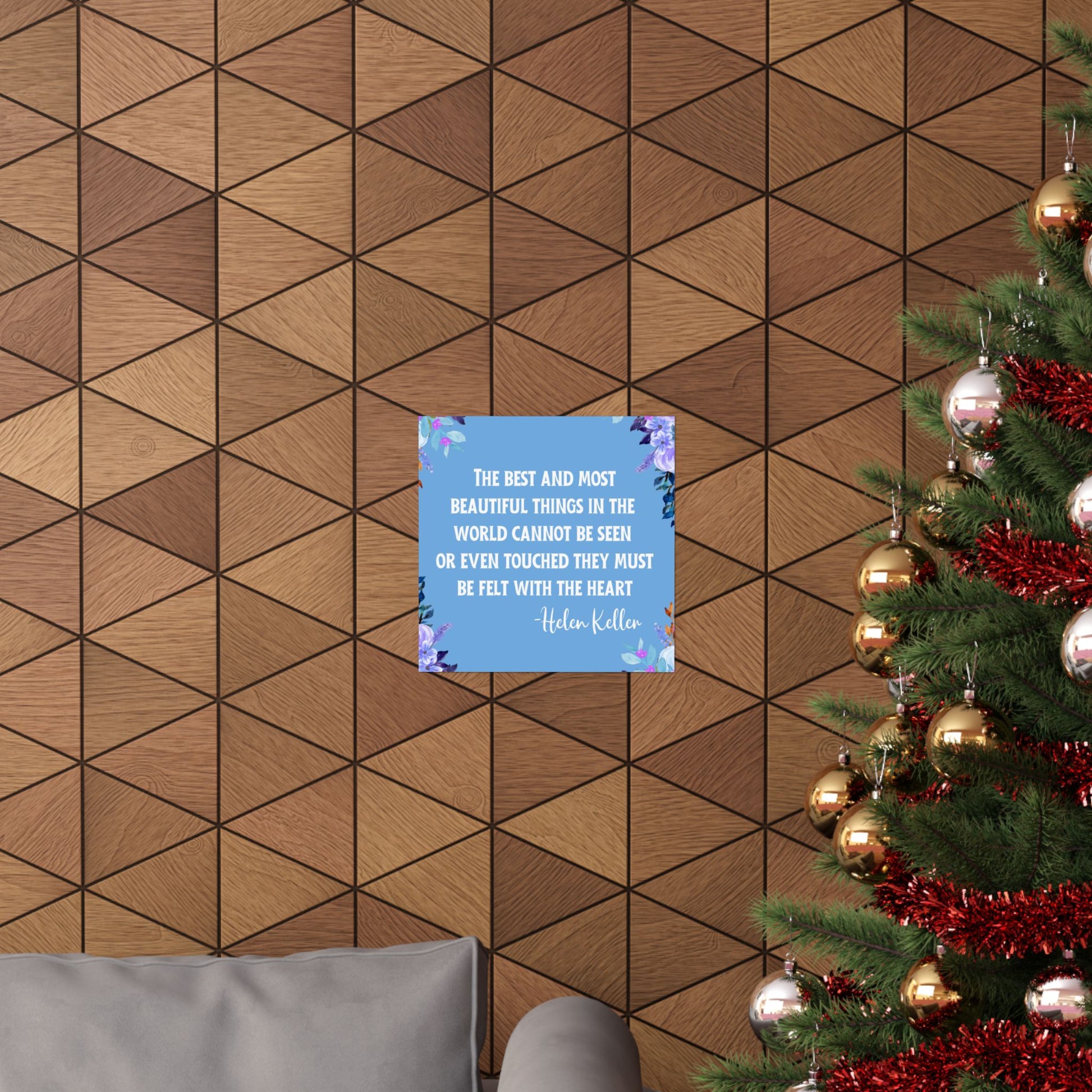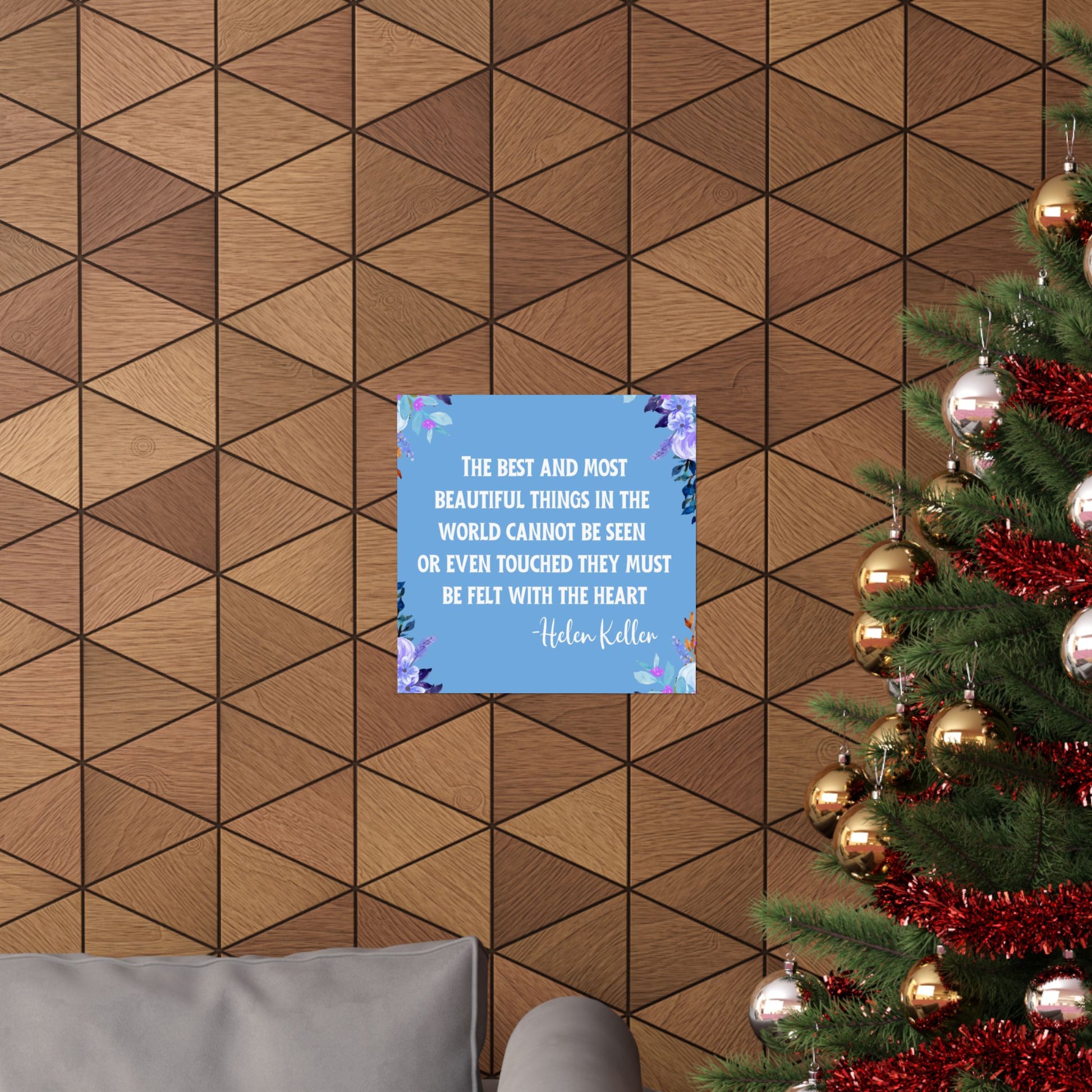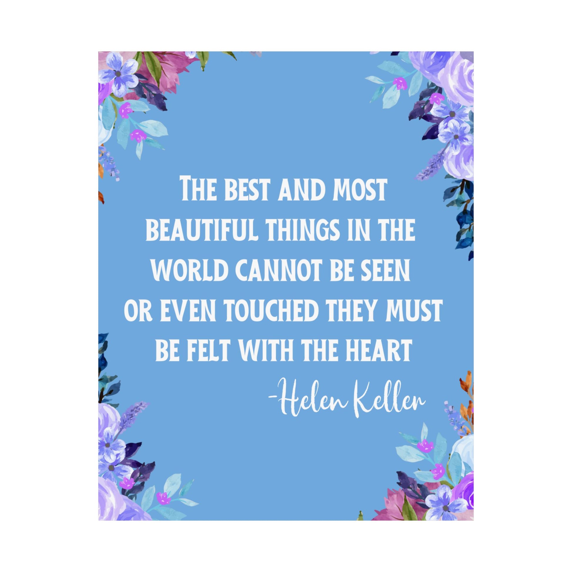 A beautiful vertical poster featuring the Helen Keller quote "The best and most beautiful things in the world cannot be seen or even touched they must be felt with the heart". This poster exudes a sense of inspiration and positivity, making it a perfect addition to any living space or office. Ideal for those who appreciate meaningful quotes and want to add a touch of elegance to their decor. Perfect for gifting on birthdays, holidays, or as a motivational present.
